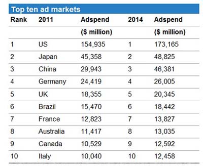 Secondo Zo, tra il 2011 e il 2014 i primi dieci mercati emergenti attrarranno più di 35 mld di dollari in pubblicità, portando la spesa globale a 535 mld di dollari rispetto ai 458 mld di quest'anno.