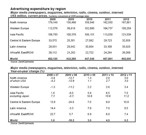 Guardando al 2011, secondo ZenithOptimedia la spesa pubblicitaria in Italia dovrebbe crescere del 3,2%, mentre nel 2012 il dato di incremento rallenterebbe al +2,8%.