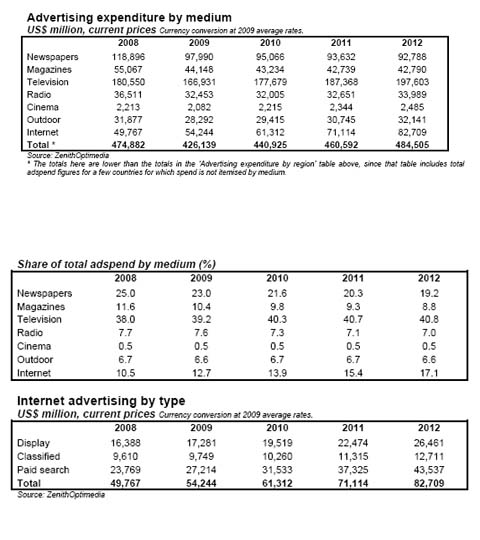 Riguardo ai mezzi, nel nostro Paese, secondo il centro media, sarà la televisione a mostrare le performance più brillanti, grazie soprattutto all'HD, allo switch off e all'affermazione della pay tv. La sua quota toccherà nel 2012 il 40,8% della spesa advertising globale rispetto al 39,2% del 2009 e al 38% del 2008. Ancora in ralenty la stampa, soprattutto i periodici, tanto che si prevede nel 2012 una quota del 19,2% (23% nel 2009), mentre prosegue l'exploit di internet che continuerà ad incrementare il suo giro d'affari: +5% nel 2010 (370 mln), +12,5% nel 2011 e +15% nel 2012, raggiungendo una quota di oltre il 16% nel 2012.