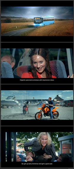 E' nata così l'idea del bus "cool", e di conseguenza tutti i dettagli del servizio sono stati ironicamente magnificati ed esagerati nel commercial: dai 'vetri panoramici' che offrono viste incomparabili (ma si mostra un passante che svuota una pattumiera), ai bottoni di richiesta della fermata (definiti miracoli di tecnica ed efficacia), fino alle maniglie per appendersi o le corsie preferenziali (con i passeggeri che sbeffeggiano gli automobilisti in coda)...Superando nella discussione e votazione finale lavori assai più complessi e 'ricchi' dal punto di vista della realizzazione tecnica - un promo per il canale HD della BBC firmato da Rainey Kelly Campbell Roalfe/Y&R, la super produzione 'Odyssey' di Quad Productions per Cartier (proposta perfino in versione da oltre 3 minuti) e il pluripremiato 'Orso' (The Bear) di BETC per Canal+ - il film danese è stato particolarmente apprezzato dalla giuria per la giusta dose di ironia affiancata a un'ottima esecuzione tecnica per un prodotto/servizio particolarmente difficile da trattare.