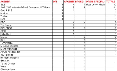 Come risulta dalla tabella elaborata da ADVexpress (sotto e in allegato) sono Saatchi & Saatchi e JWT le agenzie più premiate. In particolare S&S si è aggiudicata il Premio Best Use of Media, 1 Oro, 4 Argenti e 7 Bronzi, mentre a JWT sono stati assegnati 1 Oro, 5 Argenti e 5 Bronzi (risultati ottenuti aggregando i premi ricevuti da JWT Italia, JWT/RMG Connect e JWT Roma).