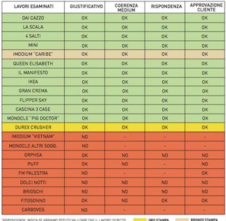 Questa tabella riepiloga l’esito dei controlli fatti dal Consiglio Direttivo Adci, nella sezione stampa e affissione, per verificare che i lavori selezionati dalla Giuria rispondessero ai requisiti esposti nella call for entries.