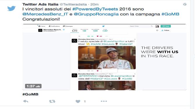 Dopo il Periscope Award dello scorso anno per la campagna #FindTheSuv, il Gruppo Roncaglia riceve quest’anno il premio assoluto e il premio nella categoria “Live” ai Twitter Awards per la campagna #GoMB realizzata in collaborazione con Mercedes Benz Italia, attraverso la quale, durante l’intera settimana del GP, da casa o dal circuito di Monza, tutti i tifosi della casa automobilistica hanno potuto riunirsi sotto l’hashtag #GoMB per sostenere il Team MercedesAMGF1 e tifare il loro campione con #GoNico e #GoLewis.