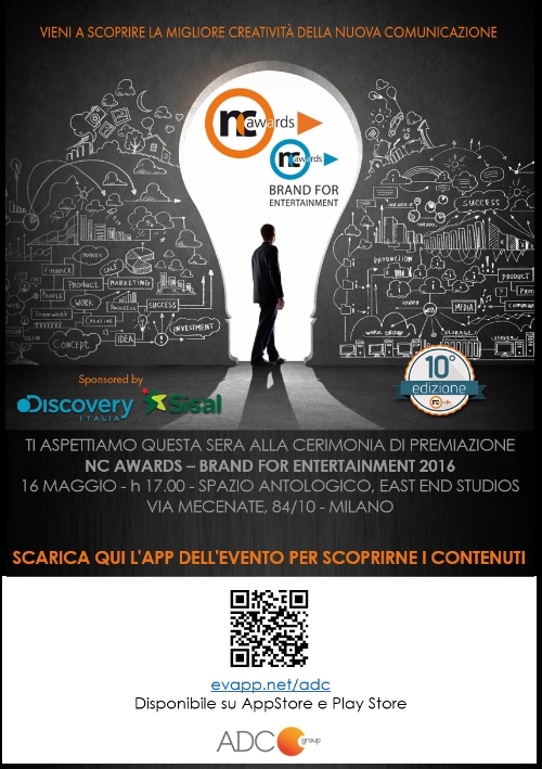 Cresce l’attesa per l’appuntamento di questa sera, 16 maggio, dalle ore 17, presso lo Spazio Antologico East End Studios di via Mecenate 84/10, Milano, con gli NC Awards - Brand for Entertainment 2016. Per maggiori informazioni sull’evento, sulle campagne iscritte al premio, sui partner dell’iniziativa e per twittare in diretta scaricate l’app dedicata e gratuita di ADC Group, disponibile su AppStore e Play Store (evapp.net/adc).