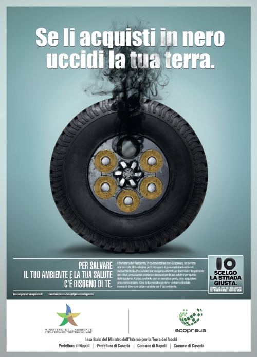 Informare cittadini e consumatori che acquistando pneumatici in nero si alimenta il fenomeno del loro abbandono; informare sulle operazioni di prelievo di pneumatici abbandonati nella Terra dei Fuochi al fine di sottrarre il ‘carburante’ dei roghi di rifiuti tossici che deturpano il territorio tra Napoli e Caserta, provocando danni alla salute della popolazione. Questi gli obiettivi della campagna ideata e coordinata da Hill+Knowlton Strategies Roma per Ministero dell’Ambiente ed Ecopneus, e realizzata con il supporto creativo di RedCell.
