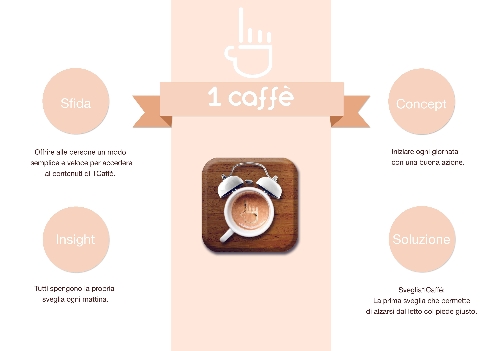 Sveglia 1Caffè. La prima sveglia che permette di alzarsi dal letto col piede giusto. Un’applicazione sul telefonino che mostra quotidianamente la lista di tutte le associazioni con le loro iniziative, consentendo di scegliere il progetto a cui inviare la donazione. Un’intuizione geniale di comunicazione sociale su strumenti mobili ha permesso a un gruppo di studenti di Fondazione Accademia di Comunicazione Milano di aggiudicarsi il Gran Prix RAI Pubblicità-Comune di Salerno 2014 al XIII Spot School Award - Mediterranean Creativity Festival.