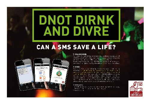 L’idea creativa parte da una ricerca della Cambridge University secondo cui l’ordine delle lettere di una parola è ininfluente per la sua corretta lettura e interpretazione purché la prima e l’ultima siano al posto giusto. Un Sms apparentemente incomprensibile, inviato al target nelle serate di S.Patrizio, invitava gli utenti a non sentirsi sicuri delle proprie percezioni e fare l’alcol test contenuto nell’app prima di mettersi alla guida. In caso di test positivo, l’app permetteva di chiamare un taxi e non rischiare la vita.