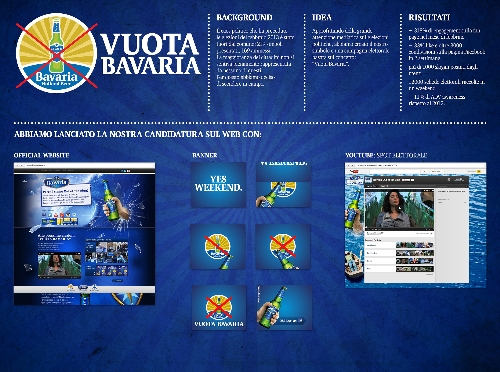Partendo dal buzz creato dalle miriadi di loghi elettorali presentati per le politiche, Bavaria e Young & Rubicam Group decidono quindi di lanciare ironicamente il proprio programma con una campagna ispirata ai linguaggi della comunicazione elettorale: ‘Vuota Bavaria’.
