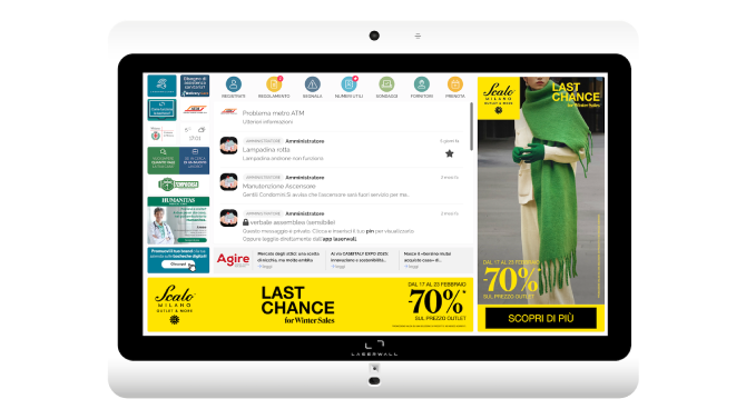 Nello specifico, la bacheca Laserwall si configura come un display digitale connesso alla rete e installato negli spazi comuni dei condomìni, pensato per sostituire la tradizionale bacheca cartacea. Dotato di software proprietario e gestione centralizzata dei contenuti, trasmette comunicazioni dell’amministrazione, notizie di quartiere, numeri utili, segnalazioni di altri condomini e messaggi pubblicitari di dieci secondi a rotazione. Il posizionamento negli atri dei palazzi, spesso vicino all’ascensore, permette la diffusione dei messaggi aziendali in un contesto privato, protetto, di attesa e privo di dispersione.