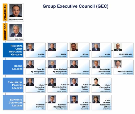 Al fine di sostenere l’integrazione tra Fiat Industrial S.p.A. e CNH Global N.V., Fiat Industrial ha creato nuova struttura organizzativa creando il Group Executive Council (“GEC”), quattro posizioni di Chief Operating Officer Regionali e un Chief Financial Officer che riporteranno al Group Chief Operating Officer Richard Tobin.