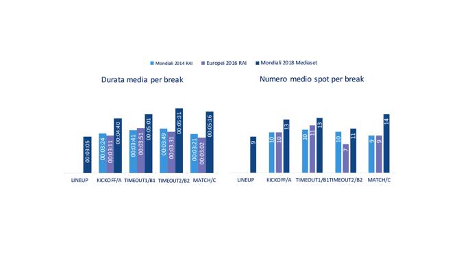 Focalizzando l’attenzione sulle partite in prime time, si può notare come i break del Mondiale 2018 trasmesso sulle reti Mediaset abbiano avuto una durata media superiore rispetto agli omologhi break delle ultime due competizioni nazionali trasmesse dalla televisione di Stato. La combinazione dei vari secondaggi ha fatto sì che anche il numero di spot all’interno dei break siano stati superiori al Mondiale del 2014 e a Euro 2016, in particolare nel break Match in coda alle partite per cui Mediaset ha stabilito un inedito primato in termini di affollamento.