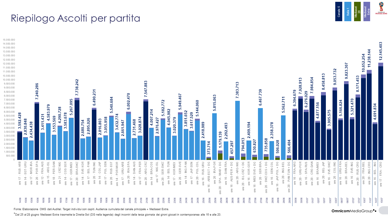 L’incontro più visto in assoluto è stata la Finale tra Francia e Croazia, che nonostante l’orario pomeridiano (calcio d’inizio alle 17,00), è stata seguita complessivamente da oltre 12,1 milioni di telespettatori (11.688.000 su Canale 5), realizzando il 69% di share. Nigeria-Argentina, durante la fase a gironi, è stata invece la più seguita tra le 35 partite trasmesse da Italia 1 (AMR 7.384.000 SHR 32,7%). Con circa 7,5 milioni di spettatori e il 36% di share per Canale 5 l’incontro più visto della fase a gruppi è stato quello tra la Svizzera e il Brasile di Neymar; sul 20 Mediaset ha totalizzato risultati di ascolto molto lontani da quelli delle reti generaliste: Spagna-Marocco è stata la più vista delle 8 partite in onda, con 809 mila spettatori e il 3,5% di share. Tra le partite giocate di giorno (Finale esclusa) invece la menzione spetta al primo degli ottavi di finale: Francia-Argentina, seguita su Canale 5 da oltre 6,1 milioni di spettatori (share 47%).