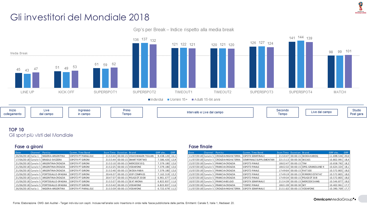 La politica di vendita dei Mondiali, in linea con l’offerta del calcio in chiaro di Publitalia, prevedeva l’acquisto del pacchetto completo per break, in modo che ogni cliente potesse presenziare lo stesso slot pubblicitario per tutte e 64 le partite di Russia 2018