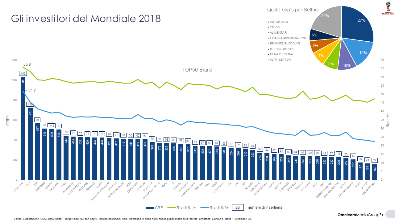 Circa il 52% della pressione pubblicitaria sviluppata dall’evento è riconducibile a 3 settori merceologici: l’automotive (27%), le telecomunicazioni (15%) e l’alimentare (10%). Il settore delle auto, confermandosi comparto leader rispetto al precedente mondiale, ha visto la propria quota di pressione crescere di ben 10