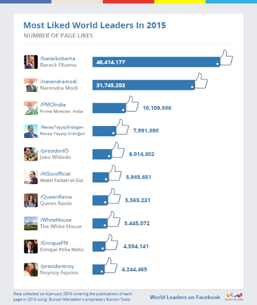Il presidente americano Barack Obama si posiziona in testa alla classifica dei leader con più' Like, quasi 47 milioni.