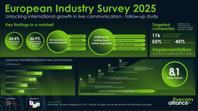 LiveCom Alliance (LCA) ha pubblicato il suo follow-up dell'indagine sul settore europeo relativa all'internazionalizzazione nella comunicazione dal vivo. I risultati mostrano che l'attività transfrontaliera sta accelerando, ma molte aziende attive a livello internazionale stanno raggiungendo i limiti di capacità e devono affrontare una crescente complessità normativa. Il settore ha bisogno di un sostegno collettivo più forte per espandersi a livello internazionale.