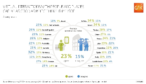 Secondo un’indagine online realizzata da GfK, a livello italiano il 20% degli intervistati si dichiara d’accordo con l’affermazione secondo la quale le interazioni virtuali valgono quanto le interazioni reali. Le donne sembrano essere le più aperte nei confronti di questo tema, con il 25% di risposte favorevoli, contro il 16% registrato dagli uomini.