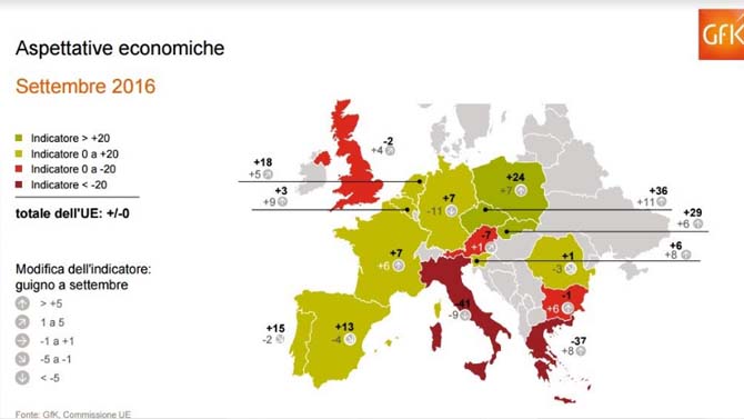 Nel complesso, l’indice di fiducia dei consumatori per l’area EU28 rilevato da GfK ha subito una contrazione da 13,1 a 12,3 punti nel periodo compreso tra giugno e settembre 2016.