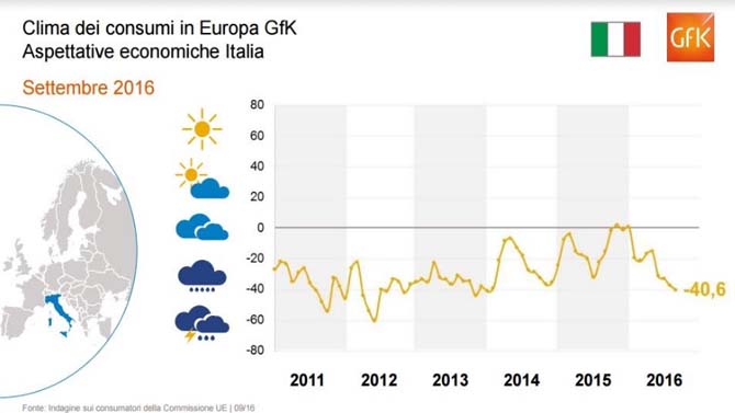 In questo contesto, gli italiani sembrano avere poche speranze nella ripresa, almeno per i prossimi mesi. A settembre, le aspettative economiche dei consumatori hanno toccato quota -40,6 punti, ovvero il valore più basso da gennaio 2014. Nel complesso, il dato risulta in calo di 9,3 punti dal giugno di quest'anno e di ben 25,2 punti rispetto a settembre 2015. A pesare su questo clima di scarsa fiducia sono sicuramente il persistere della crisi economica e finanziaria e l'arrivo di un elevato numero di migranti.