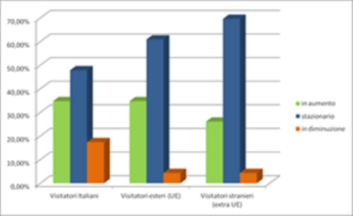 L’andamento positivo del trimestre in esame grazie ai visitatori esteri UE, con un saldo del +30%, seguiti dai visitatori extra UE (+21%) e dagli italiani (+17%).