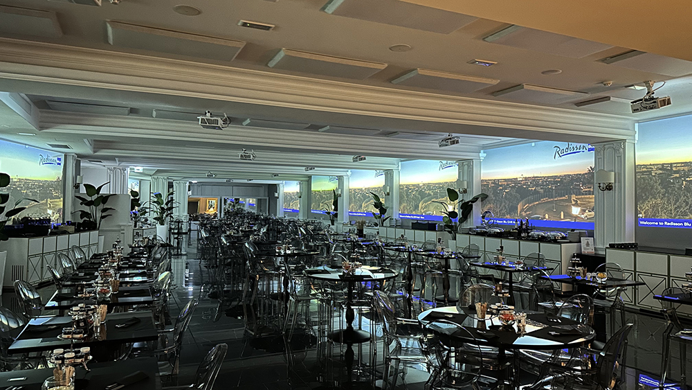 Sala immersiva della Radisson Blu GHR, le proiezioni sono disposte sui lati opposti della sala, creando due grandi schermi ultrawide. La regia tecnologia è realizzata con il supporto di un server video che consente diverse soluzioni: non solo contenuti video pre-caricati, ma si può possibile optare per video personalizzati, in linea con le esigenze dell'azienda; in alternativa si può scegliere di brandizzare i contenuti già presenti con il logo del cliente, oppure utilizzare un pay off identificativo