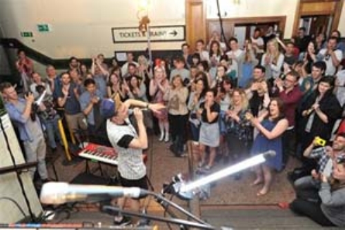 headlined the evening on a make-shift stage in the foyer of the station, which is located near the Strand in central London. The audience was made up of