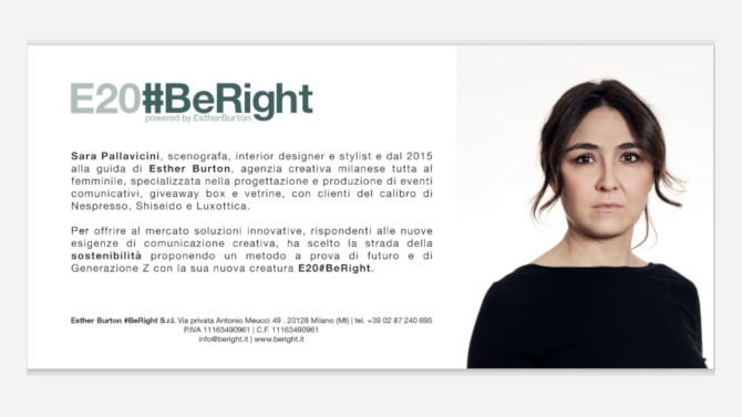 Sostenibilità, creatività e rispetto di persone e risorse sono i principi base che guidano le attività del team di Esther Burton #BeRight, dalla creazione del più piccolo packaging all’evento, dalla gestione dell’ufficio alla scelta dei fornitori, sempre informati riguardo ai materiali d’origine, al metodo di produzione e di smaltimento dei materiali utilizzati per la produzione dell’evento, incluse le azioni di compensazione sociale associate all’operazione di comunicazione.