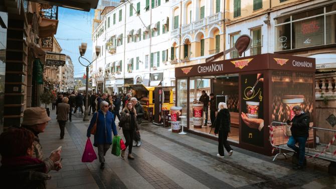 L’operazione si estende fino al cuore simbolico del Festival, con la personalizzazione del bar di fronte al Teatro Ariston: la trasformazione del Gelatè di Sanremo in una vera e propria cioccolateria brandizzata Novi, che per tutta la durata del Festival diventa punto di incontro, degustazione e racconto del marchio.