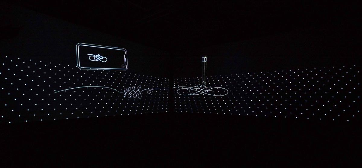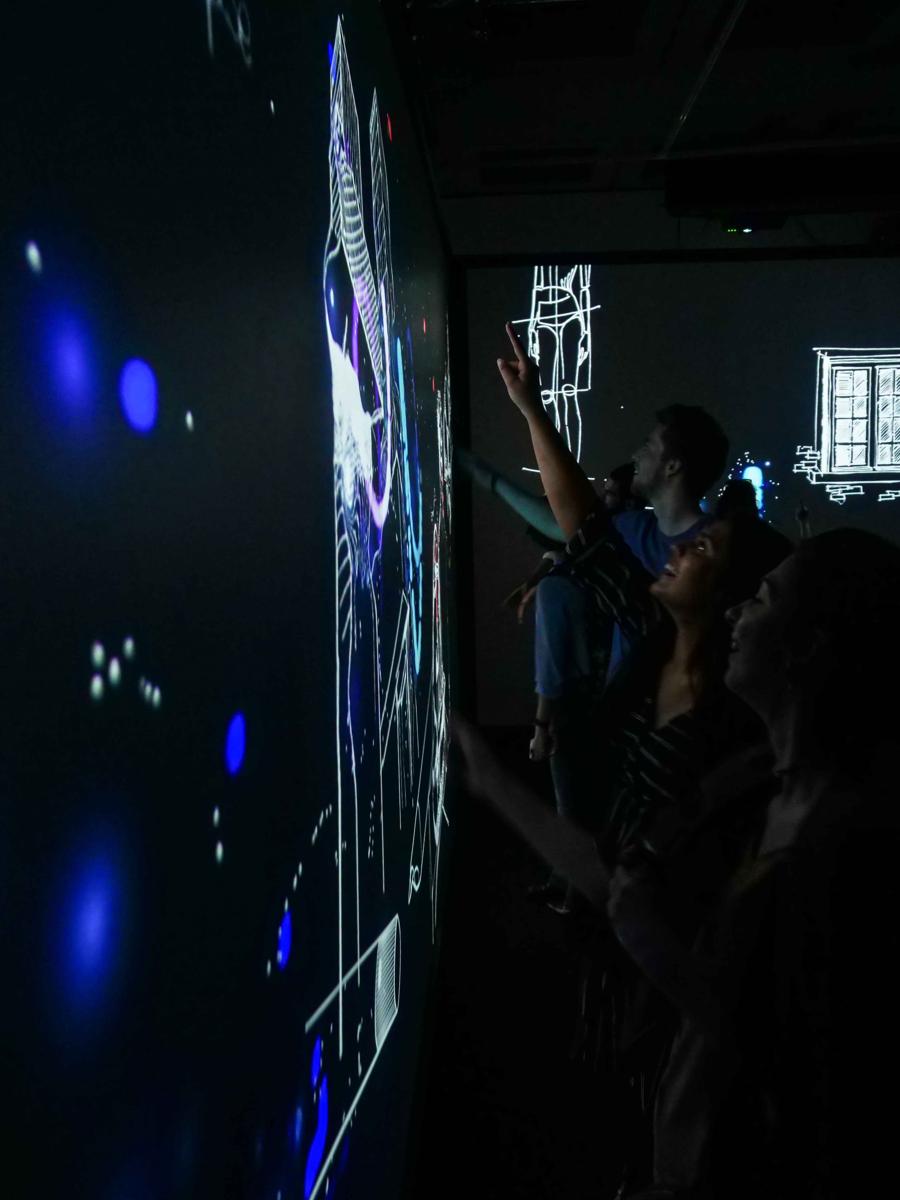 Le pareti si animano attraverso due tipi di interazione. La prima rileva la vicinanza della mano alla parete, aprendo la superficie di disegno con una sorta di particellare brillante che altera l’immagine, rappresentando la scintilla dell’idea. La seconda rileva il passaggio delle persone, i disegni che appaiono si muovono lentamente sulle pareti cambiando colore, si avvicinano alle persone, simulano di seguirle.