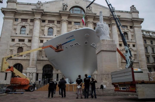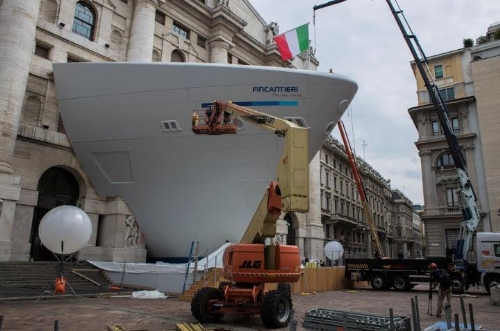 L'agenzia MP Creations di Massimo Pasquali ha realizzato un’installazione che ha reso proprio l’idea dell’approdo in piazza Affari, valorizzando, allo stesso tempo, la grandezza di uno dei complessi cantieristici più importanti al mondo.