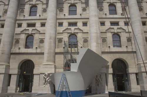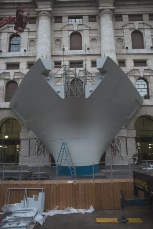 Una prua gigantesca, imponente opera architettonica di raffinata e ricercata foggia, ispirata a quella della Royal Princess, la nave inaugurata da Fincantieri lo scorso maggio, alta quasi 18 metri, è emersa a sbalzo dal palazzo della finanza, configurandosi come un ponte ideale tra economia reale e finanziaria.