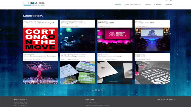 Nel nuovo sito sono stati inseriti, oltre la filosofia e il metodo che distinguono il lavoro di Studiometria, gli eventi più recenti e alcuni progetti di comunicazione, tra i quali la campagna digital per HPE e la promozione eventi Toscana Fuori Expo, realizzati nel 2016, che rappresentano le prime case history di successo del percorso evolutivo.