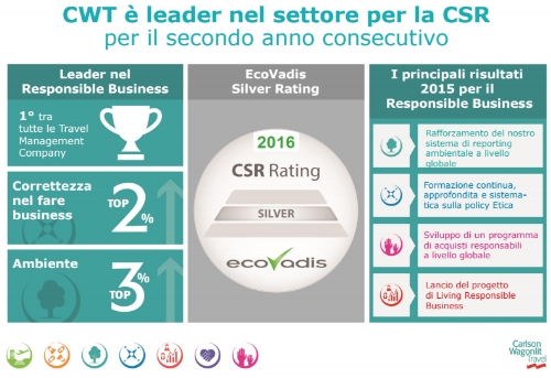 EcoVadis ha attribuito il rating Silver 2016 alle pratiche di Business Responsabile di Carlson Wagonlit Travel (CWT) e ottimi voti in tutti i principali ambiti presi in esame dal rating EcoVadis Corporate Sociale Responsibility.