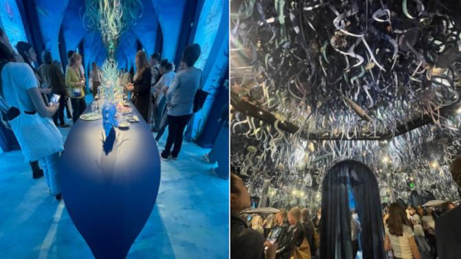 Il percorso si apre con un’anticamera scenografica: un caleidoscopio di specchi in cui si riflettono storioni in argento e una ricca composizione di flora e fauna marina sospesa dall’alto. L’effetto immersivo introduce immediatamente il visitatore nel linguaggio estetico della maison.