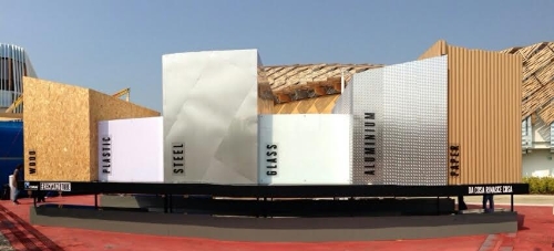 L’installazione, ubicata tra i padiglioni della Cina e della Colombia, richiama nel profilo lo skyline di una metropoli e si articola in un tunnel interattivo di 12 metri, diviso in sei sezioni rivestite nei diversi materiali di imballaggio - acciaio, alluminio, carta, legno, plastica e vetro.