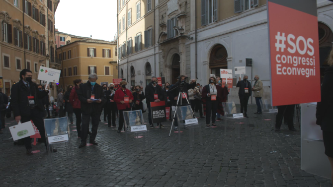 Dopo aver rivolto al Governo appelli di aiuto rimasti inascoltati, il settore dei congressi, dei convegni e degli eventi aziendali sta manifestando nel pieno rispetto delle normative Covid19 davanti a Palazzo Chigi.