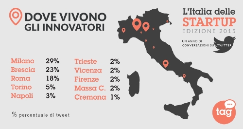 Il 2015 è stato l’anno delle startup digitali nella finanza, dell’internet of things, della sharing economy e dei bigdata mentre Brescia (23%) incalza Milano (29%) fra le città dell’innovazione mettendosi alle spalle la Capitale (18%). Talent Garden, la più grande piattaforma europea di talenti per il digitale, e IBM Italia hanno analizzato per il secondo anno consecutivo le conversazioni generate su twitter in tema di innovazione e startup, cioè circa un milione di tweet prodotti nell’ultimo anno da oltre 111mila utenti unici.