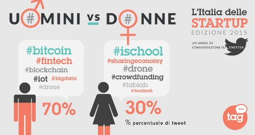 Milano (29%) si conferma la città degli innovatori, seguita a ruota da Brescia (23%) che si piazza davanti a Roma (18%). Sono ancora preponderanti i numeri delle discussioni su Twitter nelle città del nord ma anche le province iniziano a parlare di startup e innovazione. Il Mezzogiorno è rappresentato da Napoli, al 5° posto con il 3%, e da Palermo, quindicesima. Dietro a Napoli si mettono in evidenza Trieste, Vicenza, Firenze, Massa e Cremona. Analizzando i tweet in base al genere, gli uomini restano stabilmente in maggioranza (70%) e concentrano l’attenzione su argomenti tecnici e finanziari mentre le donne - il cui impegno in ambito startup risulta ovunque in crescita - dimostrano maggiore propensione verso la condivisione, la creatività e la formazione.