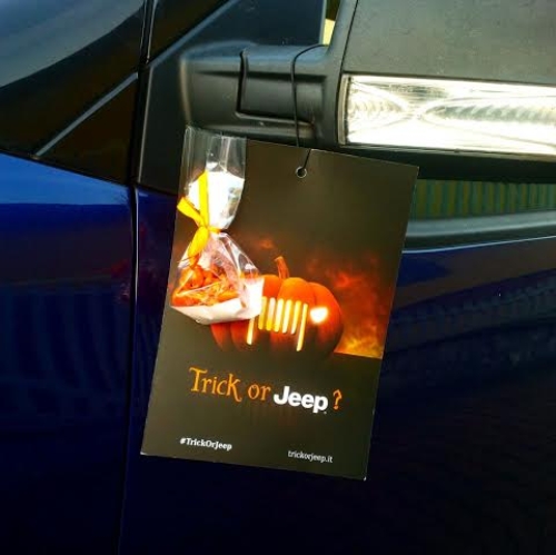 Il flagship di Fiat Chrysler Automobiles sceglie Halloween per un’irriverente operazione di guerrilla marketing accompagnata da un’azione virale su tutti i canali social: nella notte del 31 ottobre, i Suv e fuoristrada delle marche concorrenti sono stati 'marchiati' con un’impronta di pneumatico fangosa sul parabrezza, un flyer cartaceo con scritto 'Scherzetto!' e i termini della proposta commerciale firmata Mirafiori Motor Village. Per le auto del Gruppo FCA, invece, un sacchetto di dolci.