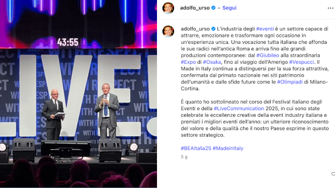 Dopo essere intervenuto sul palco del Festival Italiano degli Eventi e della Live Communication 2025, il Ministro delle Imprese e del Made in Italy Adolfo Urso ha scelto i social per amplificare il messaggio lanciato davanti ai protagonisti dell’event industry italiana, rilanciando la vocazione culturale e il ruolo economico del settore.