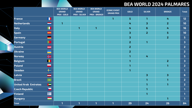 Bea World 2024. La Francia domina il medagliere con 1 GP Iconic, 5 Ori, 1 Argento e 4 Bronzi. Nella Top 5 seguono Paesi Bassi, Italia, Spagna e Germania