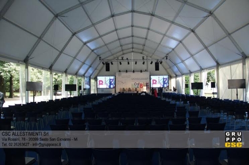 Sugli altri lati, per il noleggio della tensostruttura sono stati forniti invece teli in PVC bianco oscurante, per permettere la perfetta proiezione degli interventi sui megaschermi. Tutti gli oratori dell'assemblea hanno parlato dal palco che CSC ha fornito a noleggio insieme alla tensostruttura stessa.