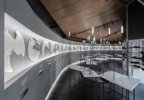 Tutti i motivi geografici sono stati disegnati con l’aiuto di appositi stampi finalizzati a riprodurre sulla tecno-superficie DuPont Corian le mappe topografiche del Nunavut con un’elevatissima precisione e realismo.