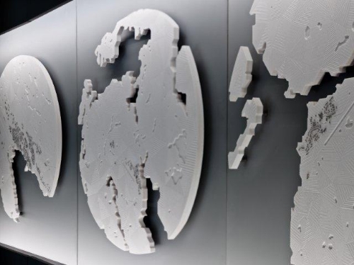 I plastici appesi, attrattiva principale dell’esposizione, sono del diametro di 71 centimetri e sono stati realizzati sovrapponendo da due a cinque strati di DuPont Corian e modellando topografia e morfologia delle comunità attraverso la tecnica della fresatura.