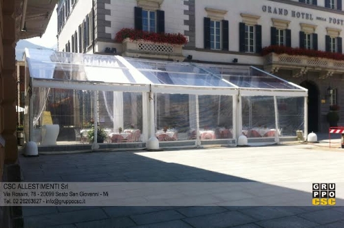 La tensostruttura a noleggio Csc collocata nella 'Piazza del Gusto' era una tensostruttura m 15 x 5 arredata internamente con tavoli e sedute e completata con un controsoffitto Csc a drappeggio.