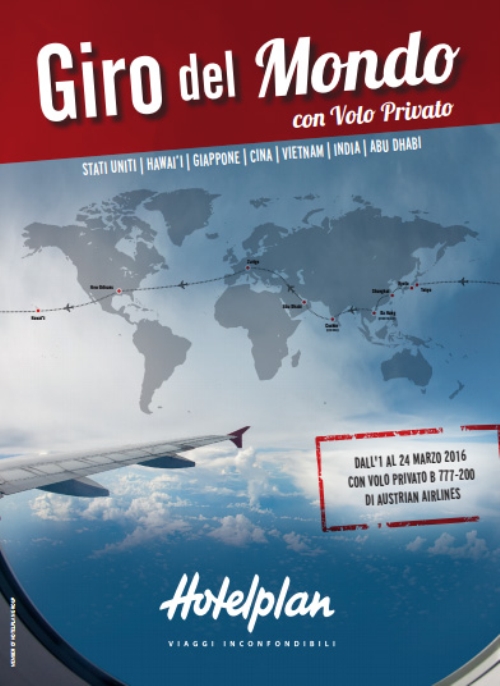 Il giro del mondo in aereo privato da oggi è possibile con Hotelplan che propone un itinerario in esclusiva di 24 giorni con partenza unica il 1 marzo 2016 da Zurigo, con tappa a New Orleans, Hawai’i, Tokyo, Kyoto, Da Nang, Cochin, Abu Dhabi, fino a rientrare a Zurigo, a bordo di un Boeing 777 privato della Austrian Airlines.