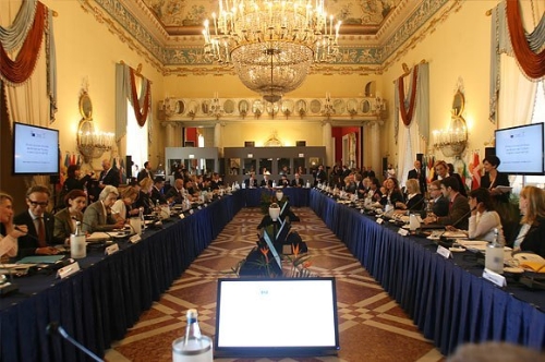 Il Salone da Ballo, in cui erano state sistemate cinque cabine interpreti a tre posti, era stato allestito con traduzione simultanea digitale (disponibile anche in conferenza stampa) e Conference system con 80 postazioni microfoniche e otto monitor di ripetizione all’interno del grande tavolo rettangolare.