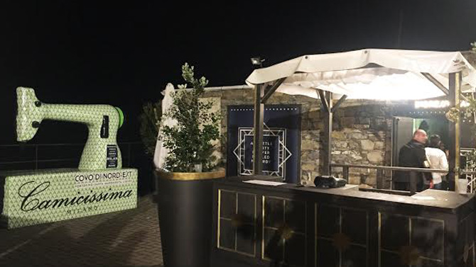 L’impareggiabile 'stile Covo' oggi si completa con le camicie Camicissima, proposte in nero e personalizzate con la scritta color oro 'Camicissima for Covo di Nord Est'. La collaborazione, inoltre, è resa ancor più evidente dalla presenza di una macchina da cucire in vetroresina Camicissima, che svetta dominante sul mare e che, per l’occasione, è stata personalizzata anche con il brand del Covo di Nord Est.