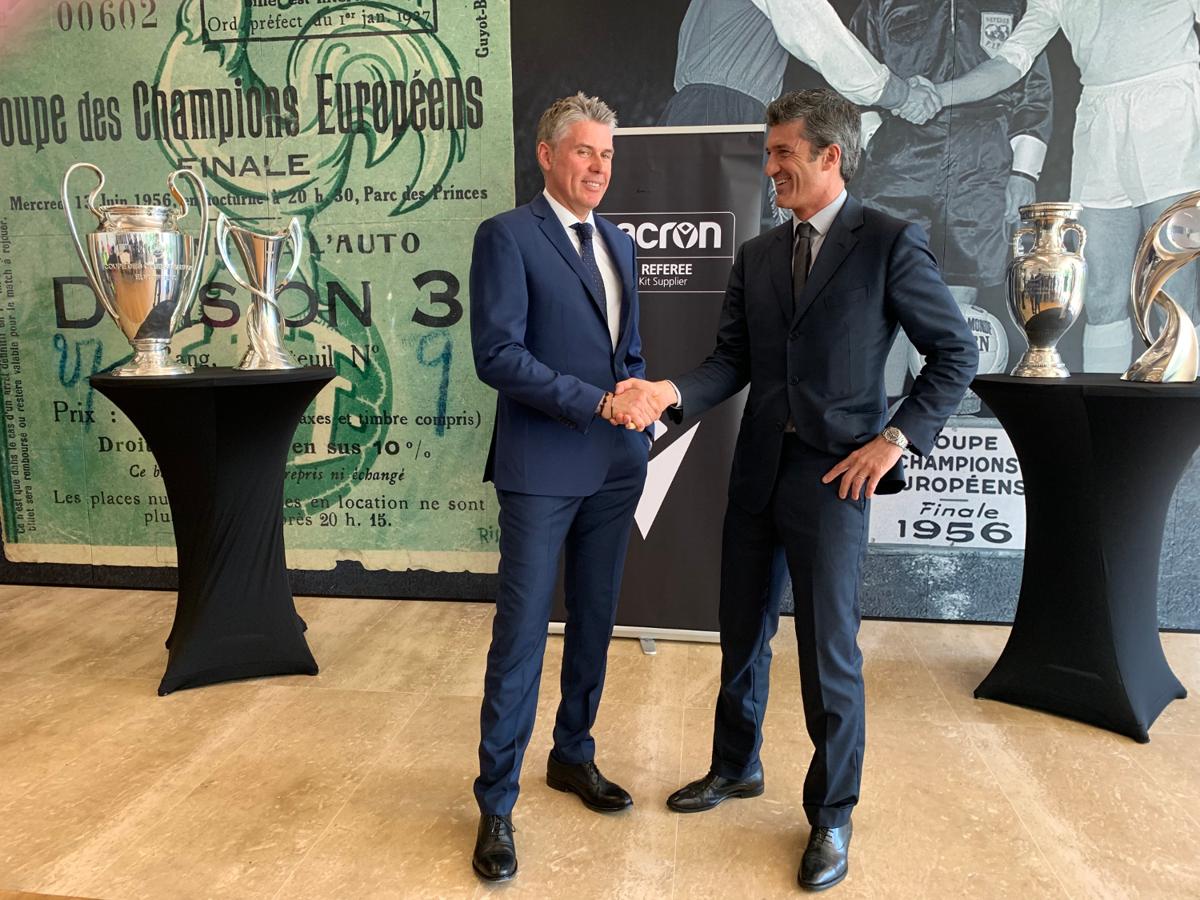 L’ufficializzazione dell’accordo è avvenuta ieri, 23 maggio, presso la sede della UEFA a Nyon, dove Roberto Rosetti (foto in alto, a sinistra), responsabile del settore arbitrale UEFA, e Gianluca Pavanello (foto in alto, a destra), Ceo di Macron, hanno celebrato la partnership svelando le nuove divise.