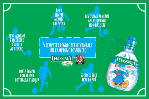 Lo sa bene Levissima che anche in questa occasione, attraverso la voce del simpatico personaggio Issimo, ha incoraggiato i piccoli tifosi a idratarsi correttamente, fuori e dentro il campo da calcio, attraverso 5 'regole d’oro': bevi almeno 8 bicchieri d’acqua al giorno, bevi senza aspettare di avere sete, bevi mentre fai sport, porta sempre con te una bottiglia d’acqua, sotto il sole bevi di più.